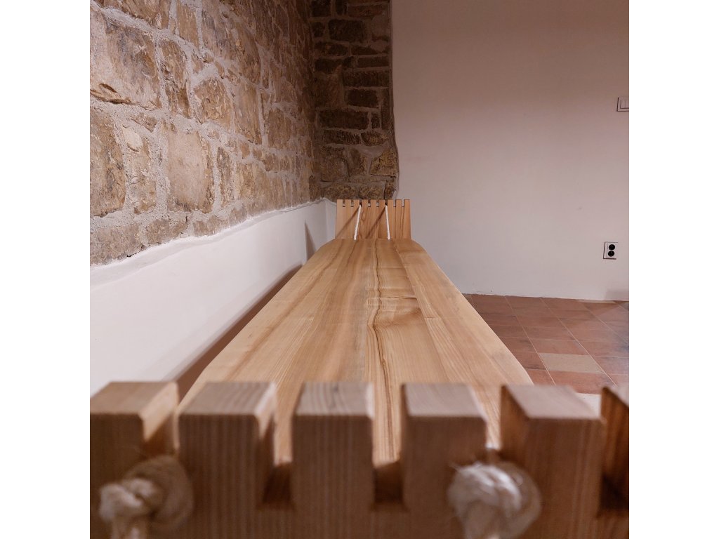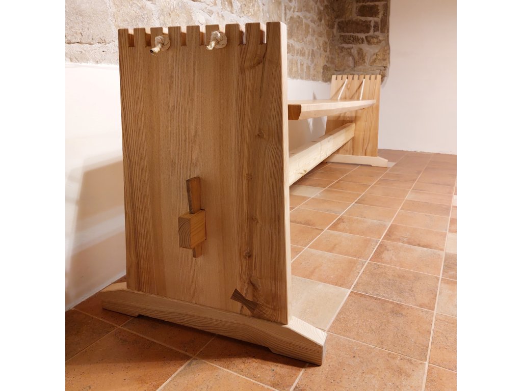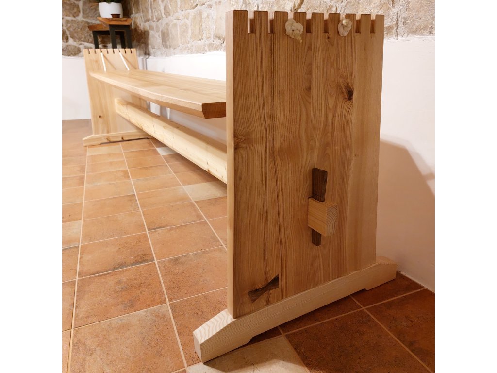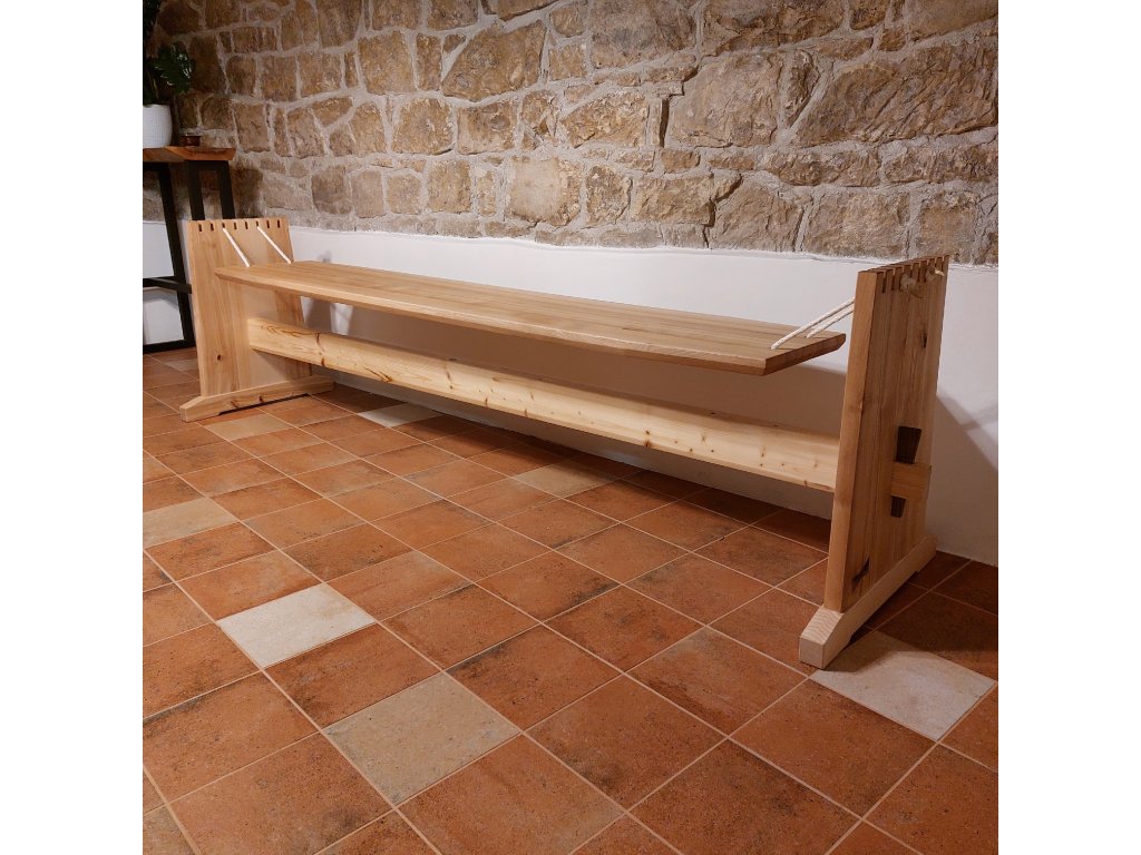 Rozměry lavice samotné jsou 2030 mm x 400 mm. Stojky jsou vysoké 670 mm a v základně široké 700 mm. Není to žádný drobek, celkem zabere prostor minimálně 2,6 m x 0,7 m. Pohromadě drží celá konstrukce pomocí tradičních truhlářských spojů, balíček vrutů a šroubků byste hledali marně, protože těchto moderních vymožeností prostě není třeba:-)